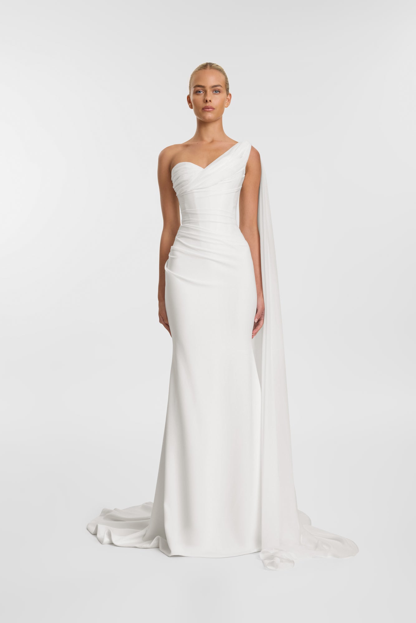 FIT: Draped fit and flare gown with sweetheart neckline, structured bodice and chiffon scarf on left hand side.